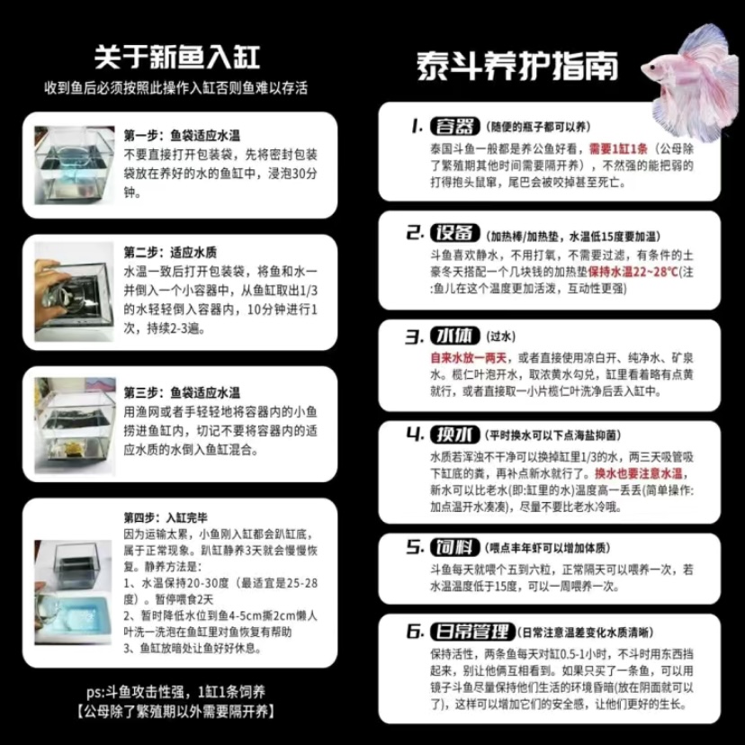 我们的半月斗鱼规格多样,成鱼体长一般在 8-10 公分,还有 5.5-7 公分的高货可供选择,满足您不同的饲养需求。